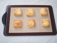 四氟烤盤片又叫烘焙用高溫布/食品烤盤片/不沾布/籠屜布。是專為電烤箱、微波爐、蒸籠等家用烘烤設備設計研發的。是以進口玻璃纖維基布上涂覆聚四氟乙烯經過特殊工藝而形成耐高溫380度的復合玻纖布。 烤盤片按照所使用的加熱器材不同可以制作成烤籃、高溫墊片、烤盤片,并取得FDA食品認證和SGS檢測報告,客戶可以安全、放心地使用。